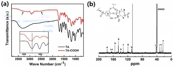 (a) FTIR spectra of TA and TA–COOH and (b) 13C-NMR spectrum of TA–COOH.