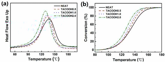 As an aim to maintain a certain interface interaction between the TA–COOH and the epoxy matrix after curing, we selected anhydride as curing agent. The use of anhydride as curing agents has been extensively reported [29,30]. Here the influence of introducing TA–COOH on the curing behavior of epoxy/anhydride system was studied. Figure 3 compares the DSC and conversion curves of the neat epoxy and the samples with different TA–COOH loadings. As is mentioned above, the use of TA–COOH produces an increase in the viscosity of the mixture. Thus, it would decrease the mobility of the propagating species and lower the reaction activity. However, compared to the neat epoxy system, the TA–COOH modified epoxy resin systems show lower curing temperature and the curing temperature decreases with increase the loading of TA–COOH. This implied that the incorporation of TA–COOH could accelerate the epoxy/anhydride curing reaction.