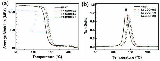 Storage modulus (a) and tan delta (b) versus temperature for the neat epoxy and TA–COOH modified epoxy resins.