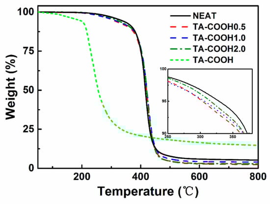 TGA curves of cured neat epoxy and thermosets with different TA–COOH loadings are shown in Figure 7. As we can see, both neat epoxy and TA–COOH modified epoxy show only one similar degradation stage, indicating that a homogenous structure of the matrix is formed and the breakage of bonds in the network structure occurs simultaneously. After careful observation, it can be seen that the initial degradation temperatures (T5%) of the thermosets with different TA–COOH loadings are slightly lower than that of neat epoxy (as shown in the inset of Figure 7). In addition, it is worth mentioning that the T5% increases with an increase in the amount of TA–COOH. The combination of some effects could explain this experimental behavior. On the one hand, the thermal stability of TA–COOH is relatively low, its T5% was about 200 °C. On the other hand, the terminal carboxyl groups of the TA–COOH provide miscibility during curing and allow reaction with other network functional groups, which in turn produces greater adhesion to the matrix and may prevent the elimination of volatile fragments.