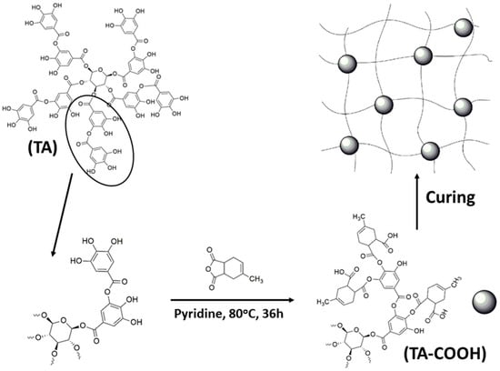 The commercial TA is given as C76H52O46. Its chemical structure was given in Scheme 1. It has 10 esterified galloyl groups linked to a glucose core. Theoretically, it contains 25 phenolic hydroxyl groups, which could serve as reactive sites and be exploited for the functionalization of TA through various reactions [26,27,28]. In this work, TA was modified by a pyridine-catalyzed esterification with a common epoxy hardener MeHHPA, generating terminal carboxyl groups. The terminal carboxyl groups could react with epoxide groups in curing process and then provide a good interface interaction between TA–COOH and epoxy matrix. The proposed structure of TA–COOH is shown in Scheme 1. First, the characterization of the TA–COOH was carried out by FTIR spectroscopy, as shown in Figure 1a. TA shows a broader OH band, which is attributed to the great hydrogen bonding interaction of phenol groups. After modification, the OH region weakens and a new carboxylic group band in the region of 2500−3500 cm−1 appears (as arrow has pointed out). The carbonylic region was also given in the inset. As can be seen, compared to the IR spectrum of TA, a new absorption peak at 1730 cm−1 occurrs, which could be assigned to the stretching vibration of C=O in the ester groups generated by the ring-opening of anhydride. Moreover, the bands at 2804 cm−1 and 2959 cm−1 are due to the aliphatic C–H vibrations of MeHHPA moiety in the TA–COOH.