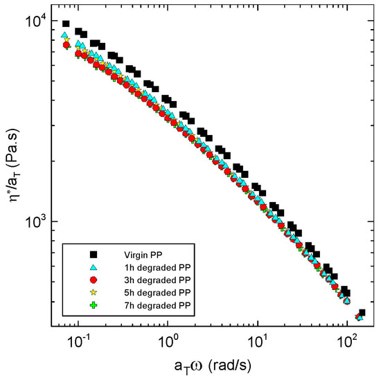 Frequency-dependent complex viscosity, η*, for virgin and degraded polypropylenes at 180 °C.