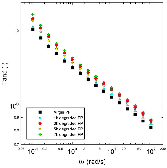 Frequency-dependent Tanδ for virgin and degraded polypropylenes at 180 °C.