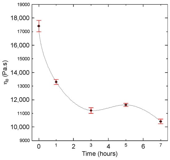 Newtonian viscosity, η0, for virgin and degraded polypropylenes obtained from shear creep measurements at 180 °C.