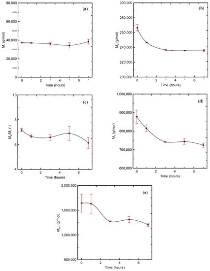 Effect of degradation time on the molecular weight distribution of investigated polypropylene. (a) Number average molecular weight (Mn); (b) Weight average molecular weight (Mw); (c) Polydisperzity index (Mw/Mn); (d) Mz average molecular weight; (e) Mz+1 average molecular weight.