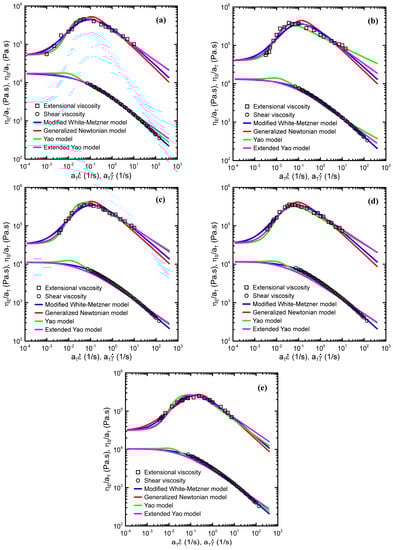 In the next step, considering validity of the Cox-Merz rule, deformation rate-dependent shear and extensional viscosities were fitted by the Generalized Newtonian law (Equations (1)–(3)) modified White Metzner model (Equations (4)–(5)), Yao model (Equations (6)–(12)) and Extended Yao model (Equations (13)–(15)). All model parameters are summarized in Table 2, Table 3, Table 4 and Table 5. Fitting error for each model was evaluated via the Average Root Mean Squared Error (ARMSE) defined as