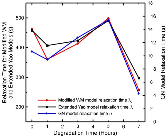 Comparison between model fitting lines and the measured data are provided in Figure 9. As can be seen, all four models have the capability to describe the measured data very well. Detailed analysis of model parameters has revealed that, firstly, the model macroscopic relaxation time plotted as the function of degradation time (see Figure 10) follows the same non-monotonic trend with local maximum at 5 hours, which was observed experimentally in basic shear flow characteristics as well as in the Mz and Mz+1 molecular weight averages, as discussed above. This suggests that during the thermal degradation of branched PP, the size and weight of the characteristic polymer coil follows the same non-monotonic trend.