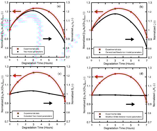 Correlation between normalized uniaxial extensional viscosity and normalized model parameters for branched PP at 180 °C for different degradation times. (a) Yao model; (b) Generalized Newtonian model; (c) Extended Yao model; (d) Modified White-Metzner model.