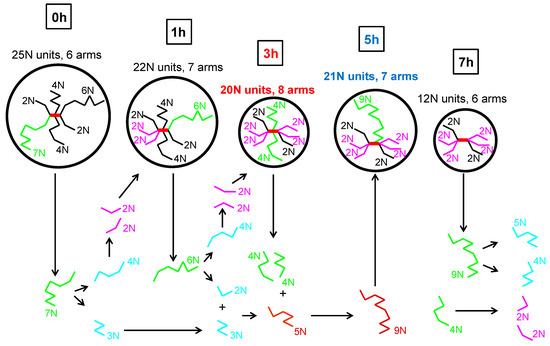 Therefore, local increase in shear viscosity, elasticity, relaxation time and molecular weight of the coil at 5 h of thermal degradation could be explained by the presence of a lower number of branches where some of them have higher molecular weight in comparison with the 3 h degraded sample. Simplified visualization of possible changes in “characteristic” star polymer coil during thermal degradation according to collected experimental data and the above-described hypothesis is provided in Figure 12. Here, the coil size is proportional to the molecular weight, the longest branches are represented by the green colour, and branches formed via branch scission and recombination reactions are represented here by blue/purple and brown colours, respectively. It should also be mentioned that the presented image of molecular changes during thermal degradation of branched polypropylene is consistent with the Bueche degradation theory and conclusions from [56], i.e., that the longest chains break first.