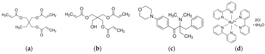 Chemical structures of (a) trimethylopropane triacrylate (TMPTA); (b) pentaerythritol triacrylate (PETA); (c) 2-benzyl-2-(dimethylamino)-4′-morpholinobutyrophenone (DBMP); and (d) ruthenium(II) complex.