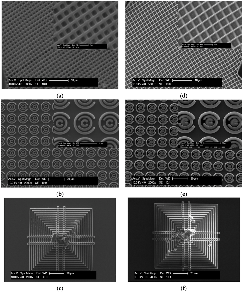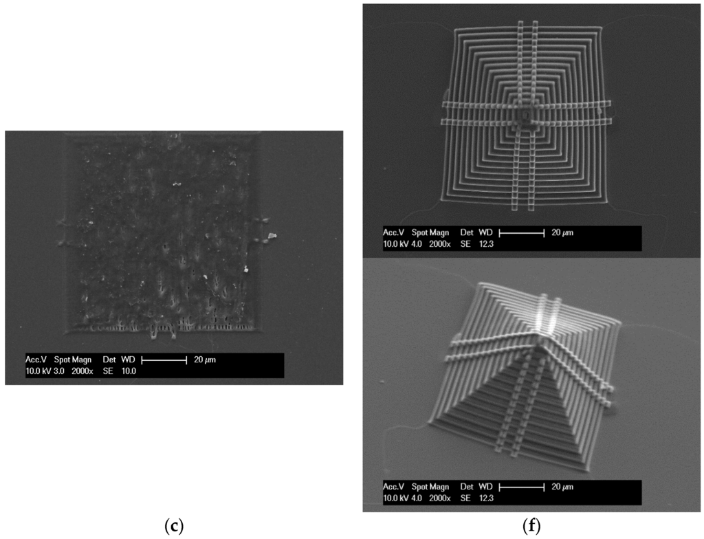 SEM images of 2D and 3D fabricated structures using Formulations 3 and 6. (a–c) show the results of fabricating increasingly more complex structures with Formulation 3 (Table 1); (d–f) show the results of fabricating increasingly more complex structures with Formulation 6; (f) shows both plan view and at a tilt angle of 30°.