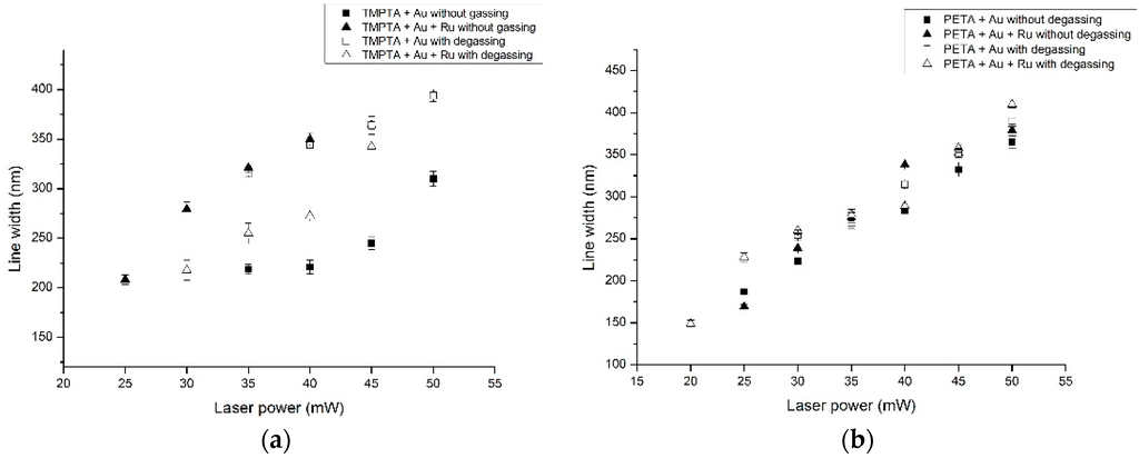 To examine further the processing differences for each gold containing formulation (2, 3, 5 and 6), single lines were written using laser powers ranging from 10 to 50 mW in increments of 0.5 mW (Figure 5a,b). From SEM images of the resulting fabrications, the line width was measured and shown in Figure 6. It can be observed that without Ru(II) and without degassing results in the smallest line width (~150 nm) using PETA. Degassing only had a significant effect when the dye was not present, and that the effect was greater for TMPTA than for PETA based formulations. It is likely that the reduction in line width, though welcome, is a result of a reduction in the number of radicals available for polymerisation propagation, since the presence of oxygen will consume a proportion of free radicals. This will have the effect of increasing the threshold intensity required for two-photon absorption, narrowing the region of the laser beam able to drive polymerisation. It can be seen therefore that there are positive consequences of an absence of the dye and removal of oxygen, but it must be counterbalanced with the observation that adding the Ru(II) complex tends to promote more stable structures and enables fabrication of 3D objects. A further experiment was performed to identify the minimum laser powers required to initiate fabrication (Table 2). This further emphasises the role that the addition of the dye has on eliminating detrimental effects associated with the presence of oxygen, whilst also illustrating the relative ease with which PETA based materials can be fabricated in comparison to TMPTA.
