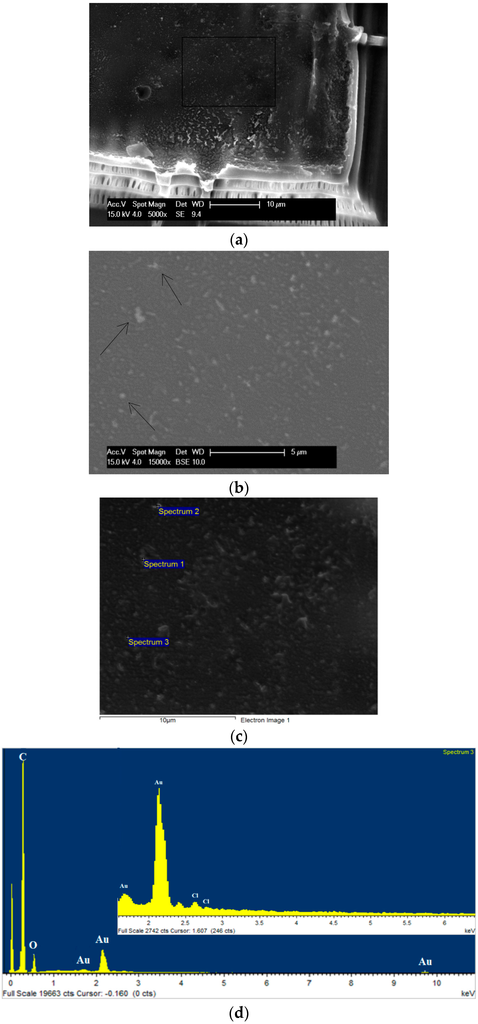 (a) Scanning electron microscope (SEM) image of a part completed 3D fabrication using Formulation 5; (b) a backscattered electron (BSE) image of the fabricated structure from (a) showing the location of suspected gold particles (arrows indicate location of particles) at higher magnification; (c) SEM image of Energy dispersive X-ray spectroscopy (EDX) of the area; and (d) EDX spectrum of the particles at location 3.