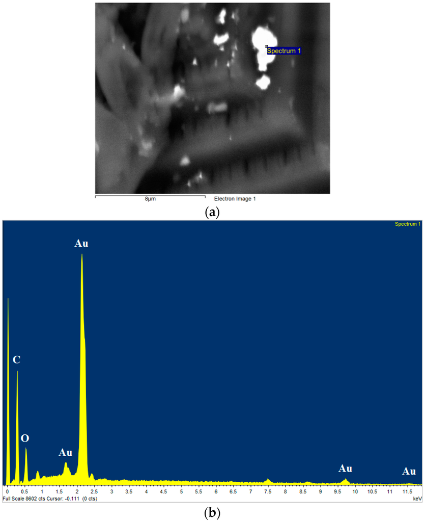 (a) A backscattered electron (BSE) image showing the presence of suspected gold particles at the surface of a structure fabricated using Formulation 6; (b) an energy dispersive X-ray spectroscopy (EDX) spectrum of the particle located at Position 1 in (a), indicating the presence of elemental gold.