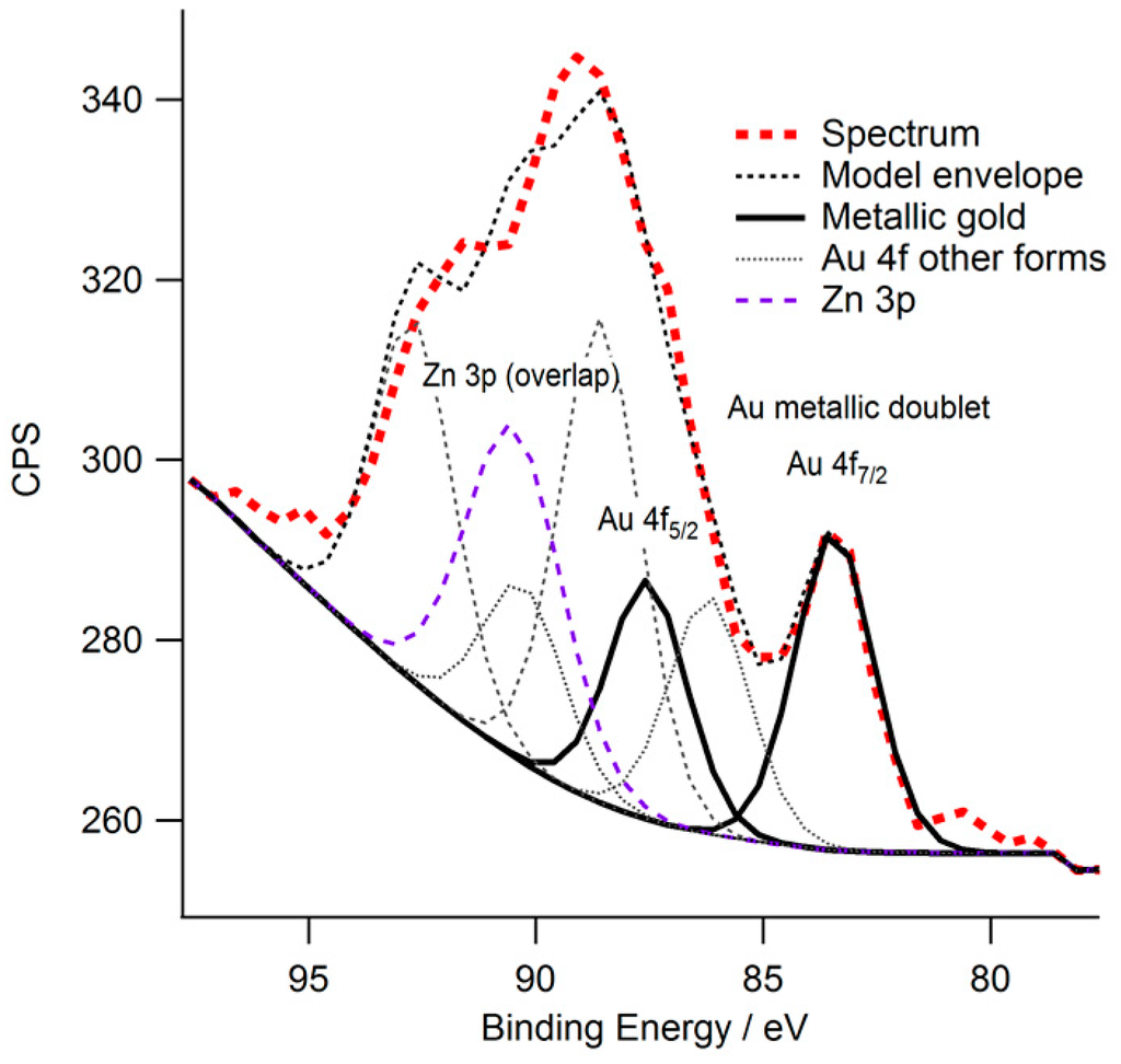 An X-ray photoelectron spectroscopy spectrum determined for a partially completed three dimensional build of Formulation 5. The peak at 83.6 +/− 0.2 eV was identified as signaling the presence gold nanoparticles proximal to the exposed surface. The remainder of the peaks are associated with gold in other, unreduced, states and with Zn from the surrounding substrate glass.