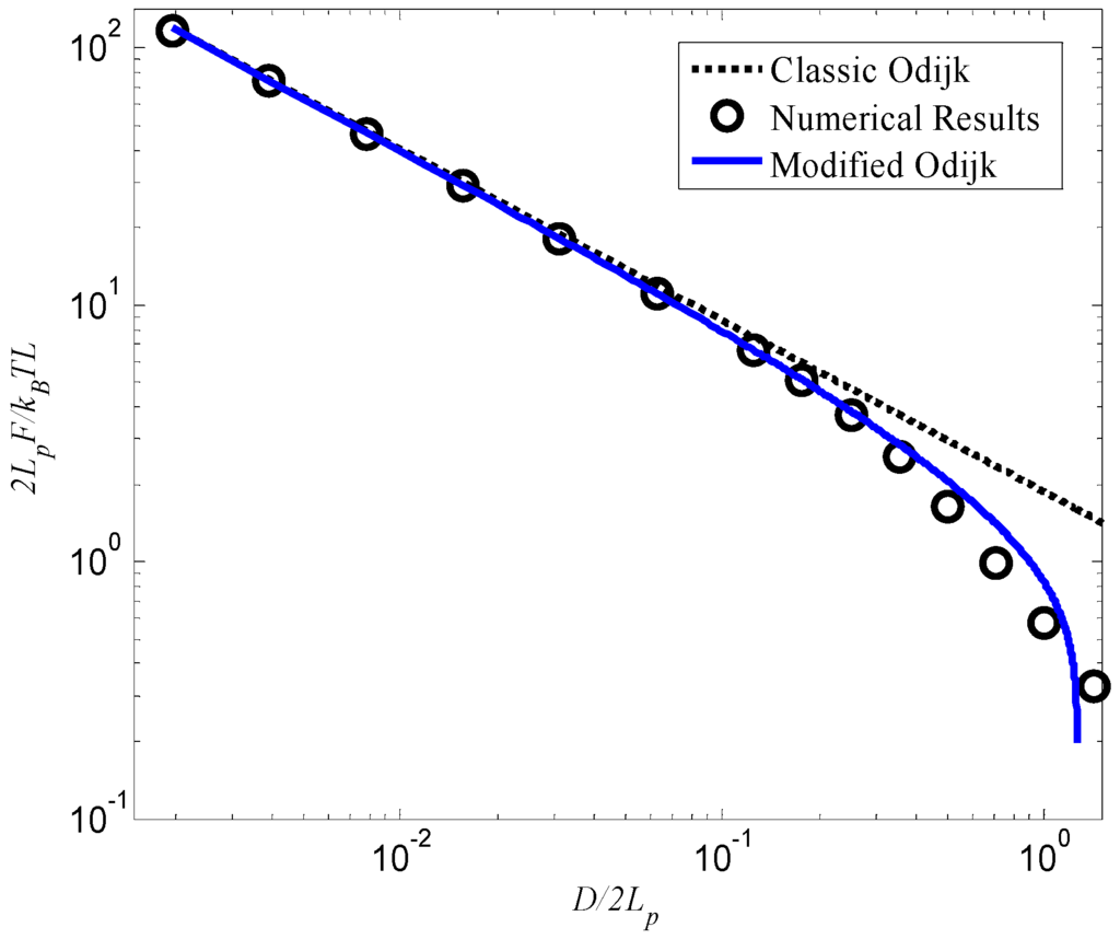 For the tube-confined WLC, Chen [16] derived a partial differential equation on the partition function of the system and numerically determined the free energy of the system by numerically finding the eigenvalue (EV) of an operator. Figure 3 shows the comparison between Chen’s numerical results, theoretical predictions based on the classic Odijk length and the modified Odijk length of Equation (32) in terms of Equation (1), respectively. It can be seen from Figure 3 that prediction based on the modified Odijk length can better match Chen’s results in [16], especially when D/Lp becomes large.