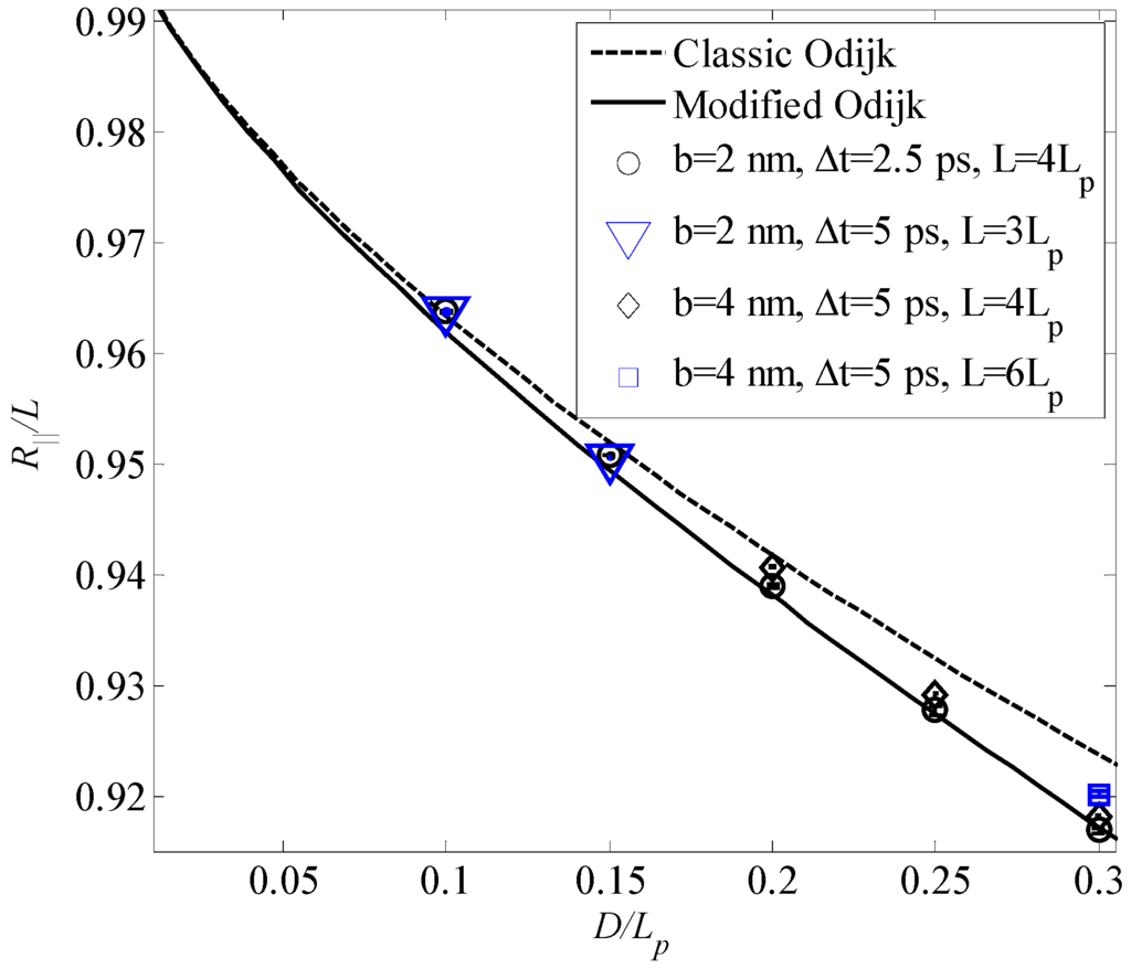 Figure 4 shows the comparison of Brownian dynamics simulation results and corresponding theoretical predictions based on the classic Odijk length, , and the modified Odijk length in Equation (32), for the normalized average extension of the WLCs confined in tubes of different diameters without stretching. Simulation parameters for bead radius, a, bond length, b, time step, , and contour length, L, are a = 0.98, 0.98, 1.7 nm, b = 2, 2, 4 nm, = 2.5 ps, 5 ps, 5 ps, and L = 4Lp, 3Lp, 4Lp, 6Lp, respectively. It can be seen from Figure 4 that results based on the newly derived formula for the average extension of the confined WLC agree with the simulation results well, and those based on the classic Odijk length shows discrepancy with the simulation results when the tube diameter becomes large.