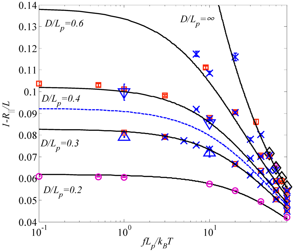 Substituting Equation (35) into Equation (26), and using the modified Odijk length, Equation (32), we obtain an expression without adjustable fitting parameters on the average extension of tube-confined WLC under stretch