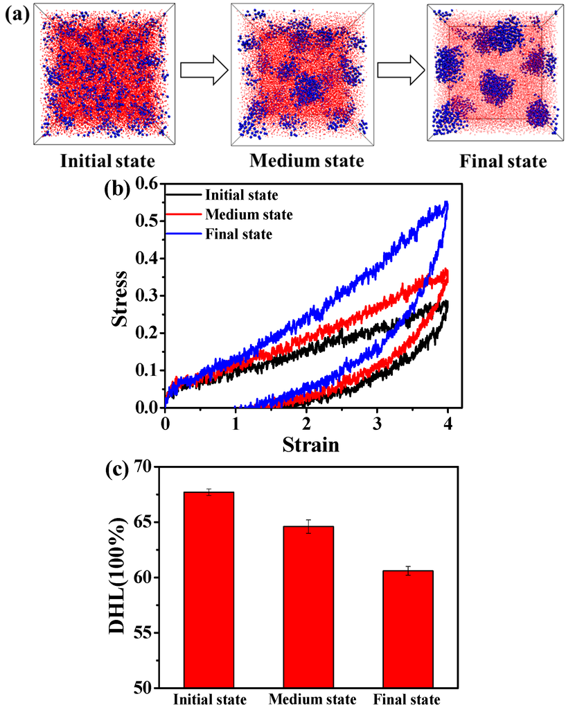 (a) The self-assembly process of the microstructure of the A5B10A5 tri-block copolymer. Note that the blue spheres represent the hard component of polymer chains, and the small red beads stand for the soft component of polymer chains. (b) The stress-strain behavior of the tri-block copolymer at three typical states. (c) The dynamic hysteresis loss (DHL) derived from the tension-recovery process.
