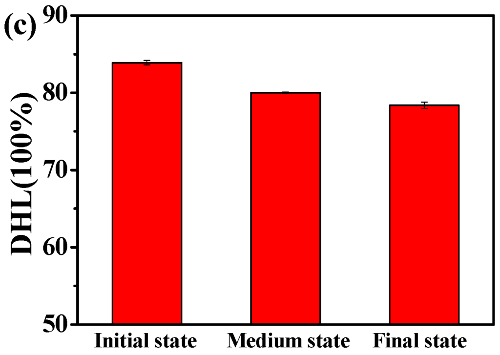 (a) The self-assembly process of the microstructure of the A5B20A5 tri-block copolymer. Note that the blue spheres represent the hard component of polymer chains, and the small red beads stand for the soft component of polymer chains. The red circle means forming a hexagonally cylindrical ordered structure; (b) The stress-strain behavior of the tri-block copolymer at three typical states; (c) The dynamic hysteresis loss (DHL) derived from the tension-recovery process.