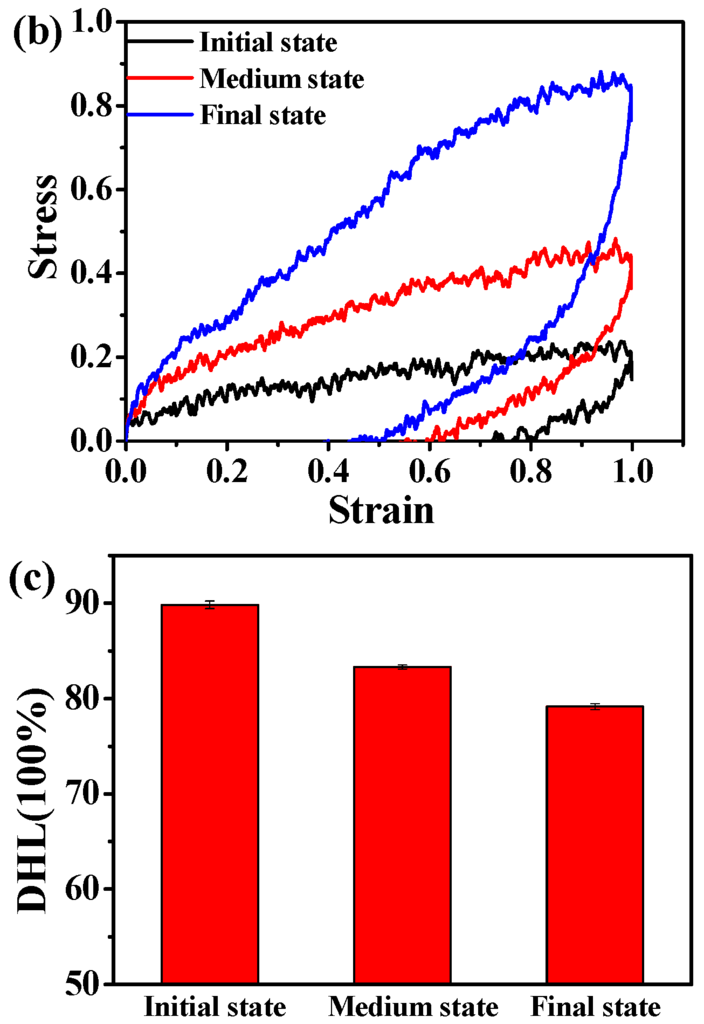 (a) The self-assembly process of the microstructure of the A5B90A5 tri-block copolymer. Note that the blue spheres represent the hard component of polymer chains, and the small red beads stand for the soft component of polymer chains. (b) The stress-strain behavior of the tri-block copolymer at three typical states; (c) the dynamic hysteresis loss (DHL) derived from the tension-recovery process.