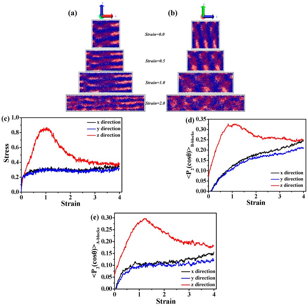 The microstructure evolutions of the A5B10A5 tri-block copolymer during the tension process in the (a) x direction and (b) z direction; (c) the stress-strain behavior of the tri-block copolymer at three different directions; the bond orientation of (d) B blocks and (e) A blocks during the tension process.