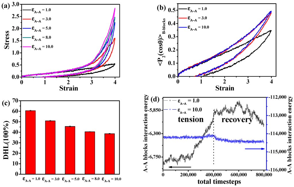 The effect of the interaction strength between A-A blocks (εA-A) (a) on the tension-recovery stress-strain behavior and (b) the bond orientation of B blocks during the tension-recovery process; (c) dynamic hysteresis loss (DHL) derived from the tension-recovery process for various interaction strength between A-A blocks; (d) the change of the total A-A blocks interaction energy during the tension-recovery process.