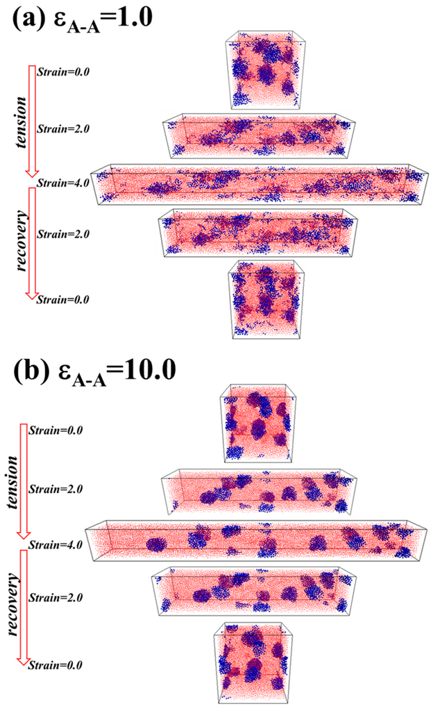 The microstructure evolution of the A5B90A5 tri-block copolymer during the tension-recovery process at: (a) εA-A = 1.0; (b) εA-A = 10.0. Note that the blue spheres represent the hard component of polymer chains, and the small red beads stand for the soft component of polymer chains.