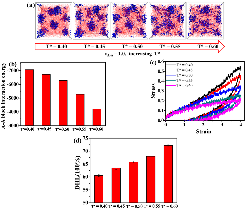 (a) The effect of the temperature on the microstructure evolution of the A5B90A5 tri-block copolymer ranging from T* = 0.40 to T* = 0.60 in the case of εA-A = 1.0. Note that the blue spheres represent the hard component of polymer chains, and the small red beads stand for the soft component of polymer chains. (b) The change of the total A-A blocks interaction energy at different equilibrated temperature; the effect of the temperature on (c) the tension-recovery stress-strain behavior and (d) the dynamic hysteresis loss (DHL).