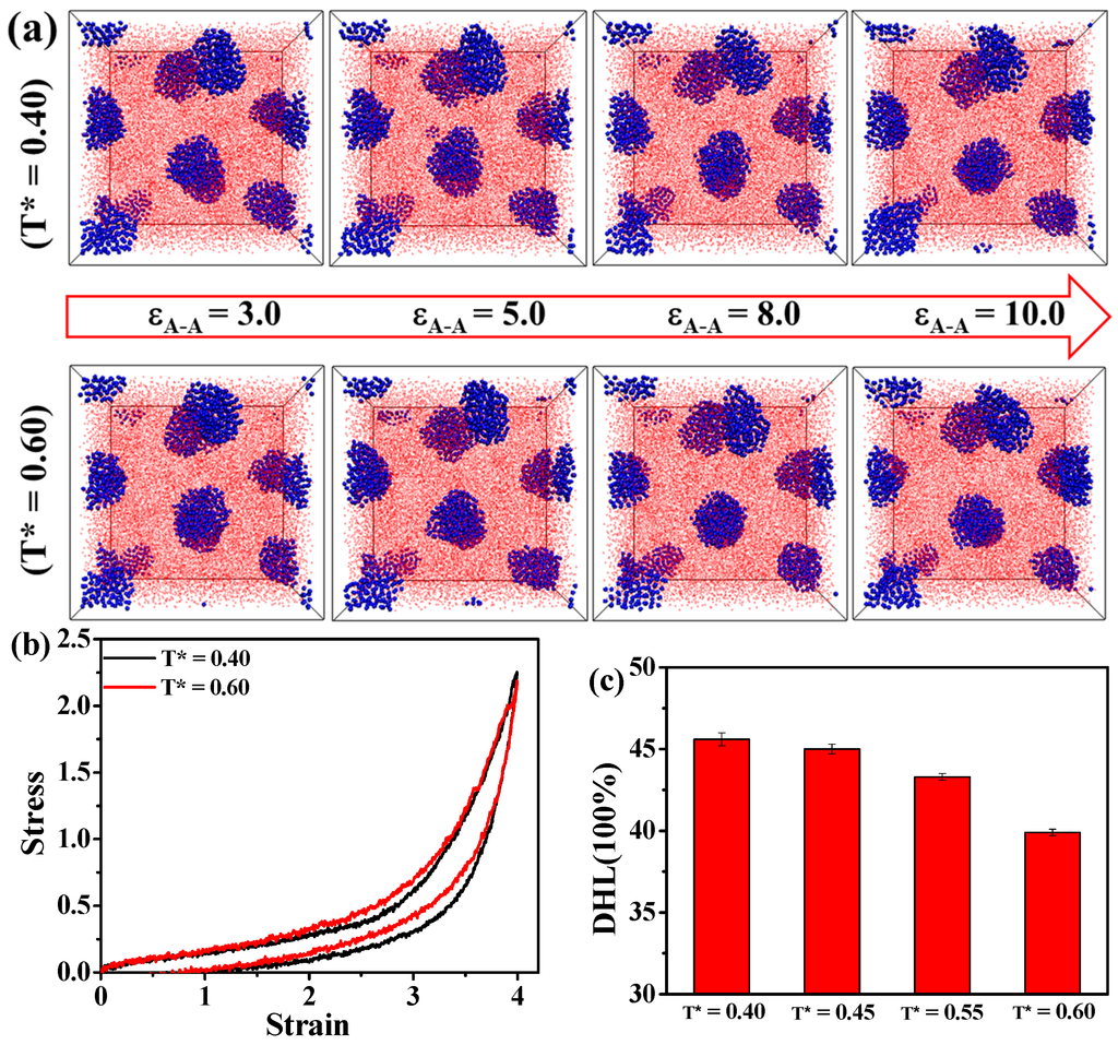 (a) The effect of the temperature on the microstructure evolution of the A5B90A5 tri-block copolymer ranging from T* = 0.40 to T* = 0.60 in the case of εA-A equal or greater than 3.0; the effect of the temperature on (b) the tension-recovery stress-strain behavior and (c) the dynamic hysteresis loss (DHL) in the case of εA-A = 5.0. Note that the blue spheres represent the hard component of polymer chains, and the small red beads stand for the soft component of polymer chains.