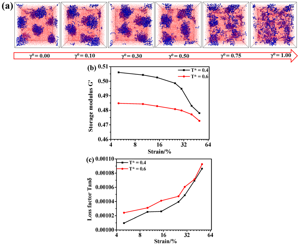 (a) The effect of the shear amplitude on the microstructure evolution of the A5B90A5 tri-block copolymer in the case of the shear frequency equal to 0.01. Note that the blue spheres represent the hard component of polymer chains, and the small red beads stand for the soft component of polymer chains; (b) The storage modulus G′ as a function of the shear strain; (c) The loss factor tan δ as a function of the shear strain.