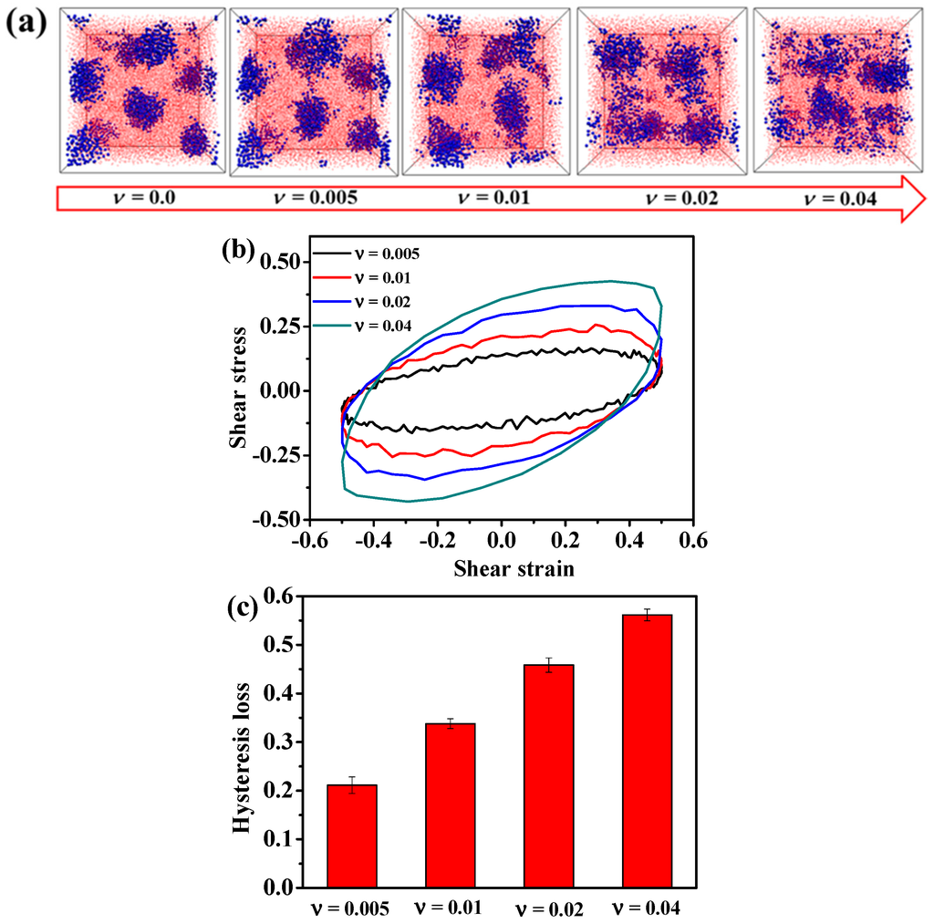(a) The effect of the shear frequency on the microstructure evolution of the A5B90A5 tri-block copolymer in the case of shear amplitude equal to 0.50. Note that the blue spheres represent the hard component of polymer chains, and the small red beads stand for the soft component of polymer chains. (b) The dynamic hysteresis loop at different shear frequencies. (c) The hysteresis loss integrated from (b) for various shear frequencies.