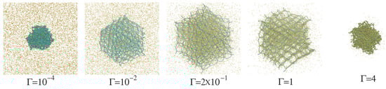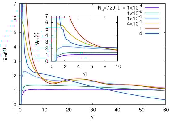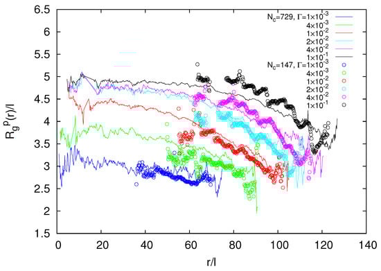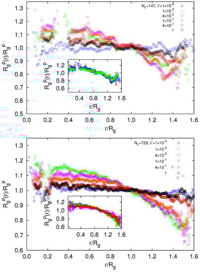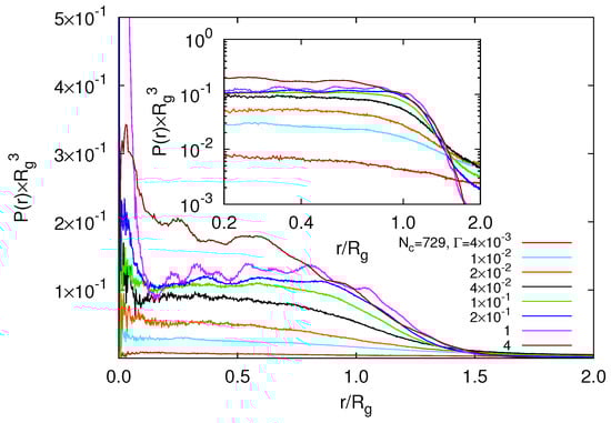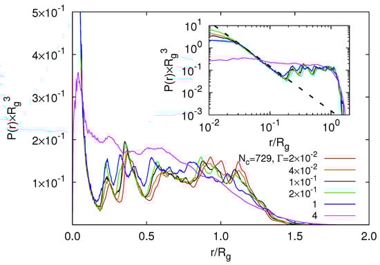 The radial modulation of the monomer concentration is reflected in Figure 9. The radial distribution function exhibits characteristic peaks due to the underlying diamond-lattice structure. Thereby, the distributions depend only weakly on Γ in the range . Only for , a rather homogeneous structure is achieved due to the gel collapse. decreases as with increasing radial distance for as shown in the inset of Figure 9. This reflects the topological structure of our system with one tetra-functional crosslink close to the center of mass. This is similar to the behavior of star polymers []. For , we find a monomer depletion zone in the vicinity of and an enhanced density at . This indicates that peripheral polymers are more compact than internal ones. A similar behavior has been found for swollen states of a microgel, where monomer interactions are described bye the Debye–Hückel potential []. From the distribution function, we anticipate that a weakly modulated radial regime of nearly-constant monomer density will appear for even larger microgel particles. Nevertheless, there remains a depletion zone near the center of the microgel.