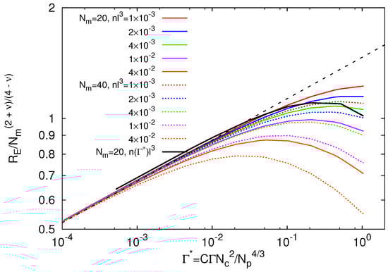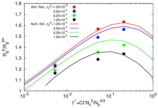 Simulation results [] for the polymer size are presented by the black solid line in Figure 2. As shown in [], the simulation results are very well described by the theoretical expression. In Figure 2, the simulation data are only in qualitative agreement with the theoretical result. The precise shape of the curves depends on the actual, Γ-dependent amount of counterions inside the microgel particle. In fact, it is important to account for the actual counterion concentration rather than its change, as confirmed by the agreement achieved in Figure 1 of [].