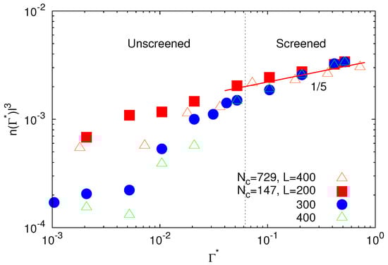 The counterion densities for the two gel sizes and 729 and the various system sizes (microgel concentrations) are displayed in Figure 3. As expected, the counterion density inside the microgel increases with increasing interaction strength. Interestingly, this increase depends only weakly on the gel and box size for , where exhibits the power-law dependence , with . This weak dependence of n on justifies our assumption of a nearly constant n in the calculation of the derivation of Equation (10) with respect to . For , we observe a significant dependence of the counterion concentration on the interaction strength. However, the Coulomb interaction is here very weak and counterions play a minor role for the microgel conformational properties []. Only for larger , electrostatics matters. This is particularly evident for the largest system with and the smaller microgel. Here, the counterion density increases rapidly in the range and approaches a rather similar asymptotic behavior as for the smaller systems. Hence, Coulomb interactions start to become essential for . This is consistent with our previous findings and our definition of the unscreened and screened regimes of electrostatic interactions [].
