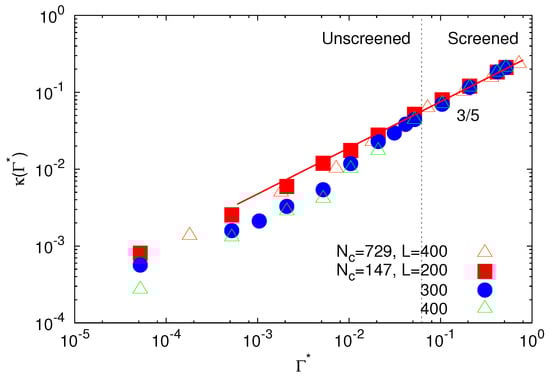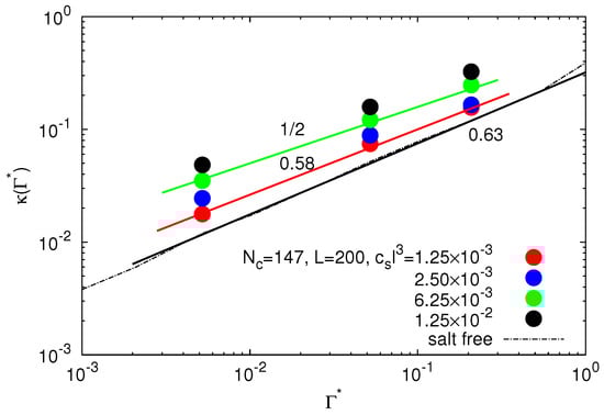 The dependence of the Debye screening length on the effective interaction strength is shown in Figure 7. Clearly, the inverse Debye length increases with increasing salt concentration. For small interaction strengths (), κ increases by the same power-law as κ of the salt-free case. However, for a larger salt content, we find the approximate dependence . Hence, the inverse Debye length increases only slowly with the Coulomb interaction strength, following essentially the definition with a concentration independent n. This implies that our analytical predictions for the polymer swelling in Figure 2 should very well describe the polymer properties for .