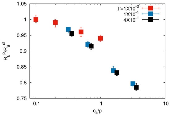 The influence of salt on the conformational properties of the polymers is illustrated in Figure 5. We add monovalent salt ions of charges , such that the overall system remains neutral. As for the monomers and counterions, the strength of the electrostatic interaction is characterized by Γ of Equation (6). Figure 5 shows average radii of gyration of individual polymers as a function of , where is the salt concentration and the network monomer density. The size of a gel particle is hardly affected by the presence of salt ions as long as for any chosen Γ. For concentrations , decreases with increasing salt content. Our results are in good agreement with previous studies. For micrometer-size gels, theoretical investigations suggest that the size of a gel particle is roughly constant with increasing salt content until becomes comparable with ρ []. Only when exceeds a certain value, a gel particle exhibits strong shrinkage. This prediction has been confirmed by various experiments [,,] and numerical studies []. Even for nanometer-size gels, numerical studies [] reported that the gel radius shows only minor changes upon an increase of the concentration of monovalent salt.