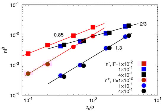 The concentration of ions inside a microgel as a function of the salt concentration is shown in Figure 6. The total number of negative ions, i.e., counterions plus respective salt ions, increases approximately in a power-law fashion in the considered range of salt concentrations. Thereby, the exponent depends on the Coulomb interaction strength. For smaller Γ (), n increases with an exponent of approximately . For larger Γ, the exponent is approximately . In any case, the concentration of ions in the presence of salt is higher. For , the ratio , where is the counterion concentration in the salt-free microgel, increases by . This increase appears rather large, but it simply reflects the linear increase in the salt ion concentration and their homogeneous distribution over the available volume. With increasing Γ, the ratio decreases, because, on the one hand, the counterion concentration is higher, and on the other hand, the counterions contained in the microgel neutralize part of the microgel charge. The ratio itself changes by over the considered range of salt concentrations. Thereby, increases in a power-law manner with increasing salt concentration with the approximate exponents , for , and , for and . The significantly higher counterion concentration inside the microgel compared to the surroundings (cf. Figure 2 of []) prevents evidently an even spread of the salt ions.