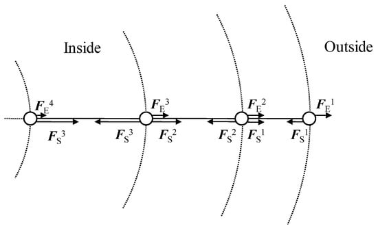 To illustrate the stronger stretching of polymers toward the center of the gel particle, we consider a radial structure of “crosslinks” as depicted in Figure 12. The crosslinks of the individual polymers are aligned in a straight line. We assume that individual polymers are stretched by electrostatic force between crosslinks, which are counterbalanced by entropic forces of polymers. Here, i enumerates the crosslinks from the shell toward the core. In steady state, the force balance at each crosslink requires: