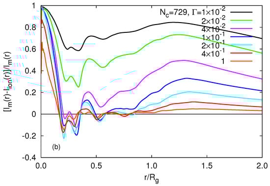 Ratio of the monomer-counterion charge difference and the monomer charge (cf. Equation (16)) as a function of the radial distance from the microgel center for the indicated interaction strengths and the microgel of size with . The radii of gyration of the microgels are 67.7, 75.1, 77.1, 81.7, 82.2, 80.7 and 78.2 with increasing Γ.