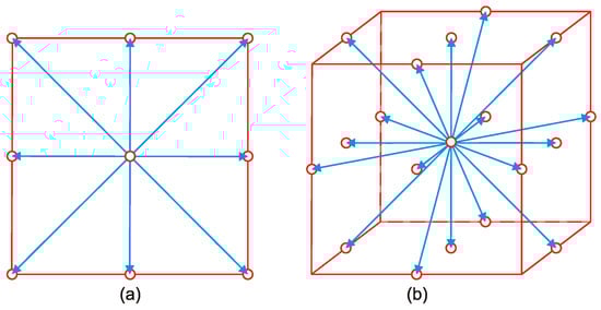LB inherits the discretized lattice dynamics based on propagation and collision steps from LGCA. However, it incorporates a one-particle distribution function as the relevant dynamic variable instead of the particle-based dynamics in LGCA. Initially, the collisions in LB is modelled by pre-averaging the collision schemes in the underlying LGCA model []. The resulting collision mechanism is then presented by a linearized collision matrix in which the distribution function relaxes toward a local equilibrium distribution [,]. In the LB scheme, thermal noises are not present which makes it much more efficient in comparison with LGCA for hydrodynamic problems. On the other hand, the intrinsic stability of LGCA is lost in LB. It should be noted that both LGCA and LB methods suffer from Galilean invariance problems and should be corrected for these limitations [].