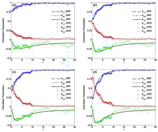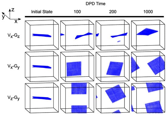 In recent years, modified versions of DPD formulation have been developed. For instance, Pan et al. [] formulated DPD by borrowing ideas from fluid particle model. This approach enabled an explicit separation of dissipative forces into central and shear components. As a further consequence of this methodology, the hydrodynamics of Brownian colloidal suspensions were correctly captured by redistributing and balancing the forces. In another study, Yamanoi et al. [] replaced the conservative forces with entanglement forces in the force field to reproduce the physics of entangled polymers. In this way, they could successfully simulate static as well as dynamic behavior of linear polymer melts. Despite these efforts, the standard DPD has also shown quite capable of simulating complex systems such as compatibilized and uncompatibilized polymer/clay nanocomposites under shear flows [,]. Various polymeric systems have been successfully treated in the DPD framework such as blood rheology [,,], rheology of ultrahigh molecular weight polymers [], lipid bilayers [], adsorption characteristics of confined PE glycols dissolved in water [], crosslinking of thermoset resins and formation of a network in the bulk [], structure of thermoset polymers near an alumina substrate [], graphene structure [], surfactant aggregation [], photo degradation process of polymer coatings [], distribution of nanoparticles in lamellar and hexagonal diblock copolymer matrices [,], surface segregation and self-repairing systems [,,], and electrical percolation threshold in packed assemblies of oriented fiber suspensions [].