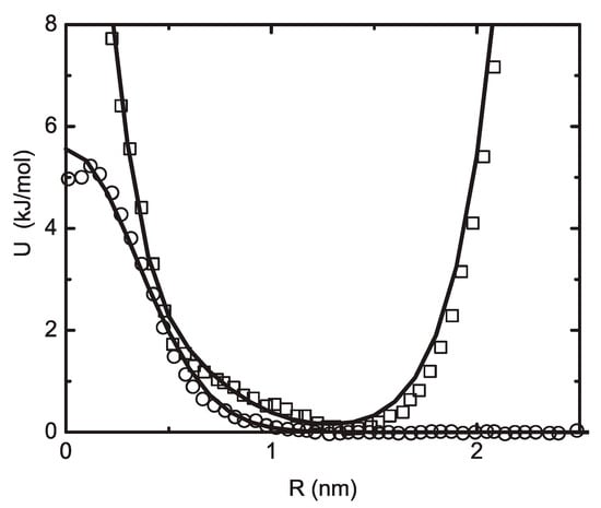 The terms and represent a random displacement and velocity change due to the random forces. One can utilize a two-dimensional normal distribution to sample these terms based on random numbers []. Consequently, the positions and velocities of the particles can be updated in every time step during the simulations. It should be noted that the momentum is not conserved in the formulation of BD due to the random noise terms. As a result, BD cannot reproduce correct hydrodynamics and is limited to the prediction of diffusion properties [,,].