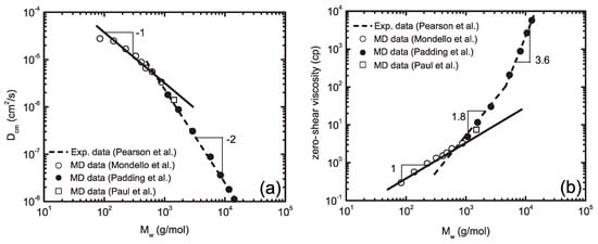 While MD is shown to be a promising and reliable method in atomistic scale modelling, it has statistical limitations. A comparison of MC and MD methods suggests that in a phase space with 6N degrees of freedom, N being the total number of particles, MC allows one to investigate many more states than MD. Therefore, the validity of ensemble averages obtained by MD is limited to the assumption of system ergodicity; an assumption which is not unambiguously proven []. Still, the great power of MD is its proficiency to predict microstructure dynamics along its deterministic trajectory at an atomistic level. Applications of MD in the field of polymeric materials include topics such as macromolecular dynamics [,,,,,], intercalation phenomena in polymer/clay nanocomposites [], structure of interfaces [,,], polymer membranes [,], crystal structures [,,], diffusion phenomena [,,,], segregation phenomena [], tribological properties and crack propagation [,,], thin films and surfaces [,,,], liquid crystalline polymers [,], rheology of polymeric systems [,,,], application of elongational flows on polymers using nonequilibrium MD [,], and the simulations of reactive systems such as crosslinking and decomposition of polymers using the ReaxFF force field [,,,].