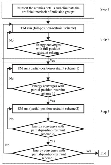 The overall algorithm of MD is to simulate the evolution of particle configurations based on an adequate force field by integrating the equations of motion over discrete steps in time. The procedure is simply to calculate the position and velocity of every particle at present and a time step later. The system of equations of motion of N particles can be solved by utilizing FDM. The Verlet technique is possibly the most common integration scheme among all [,]. Utilizing the Taylor expansion, it uses the positions and accelerations at time , and positions from the previous time step , to calculate the new positions at the next time according to