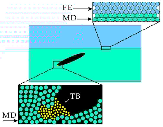 - Wagner, G.J.; Liu, W.K. Coupling of atomistic and continuum simulations using a bridging scale decomposition. J. Comput. Phys. 2003, 190, 249–274. [Google Scholar] [CrossRef]