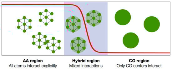 - Park, J.H.; Heyden, A. Solving the equations of motion for mixed atomistic and coarse-grained systems. Mol. Simul. 2009, 35, 962–973. [Google Scholar] [CrossRef]
