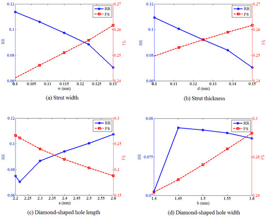 Figure 8. These results demonstrated that radial recoil and foreshortening are two conflicting measures of stent performance. The stent radial recoil decreased with the strut width and strut thickness, because the stent mechanical strength increased with the increase of these two design variables. Meanwhile, the foreshortening increased with these two design variables, because the foreshortening was larger when the stent was expanded to a greater degree. There was an optimal value of the diamond-shaped hole length to minimize the stent radial recoil in the design range, while the diamond-shaped hole width had a value that corresponded to the maximum of radial recoil. This was because the stent studied consists of diamonds and hexagons, which had common edges. The geometry of the diamond affected the geometrical structure of the hexagon, which also had an impact on the stent radial recoil. The foreshortening of stent decreased with the length of the diamond-shaped hole, and increased with the width of the diamond-shaped hole.