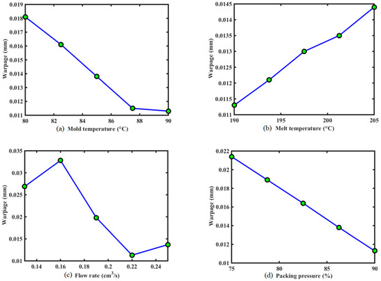 Figure 10. It reveals that, in the given design domain, these injection process parameters do not contribute equally to the warpage of the stent. The flow rate and packing pressure have the most substantial impact, followed by mold temperature, melt temperature, and packing time.