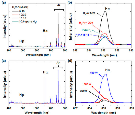 Optical emission spectra of H2/Ar plasma as functions of H2/Ar ratio at 300-W radio-frequency (RF) power (a,b) and RF power at H2/Ar ratio of 10/20 (c,d).